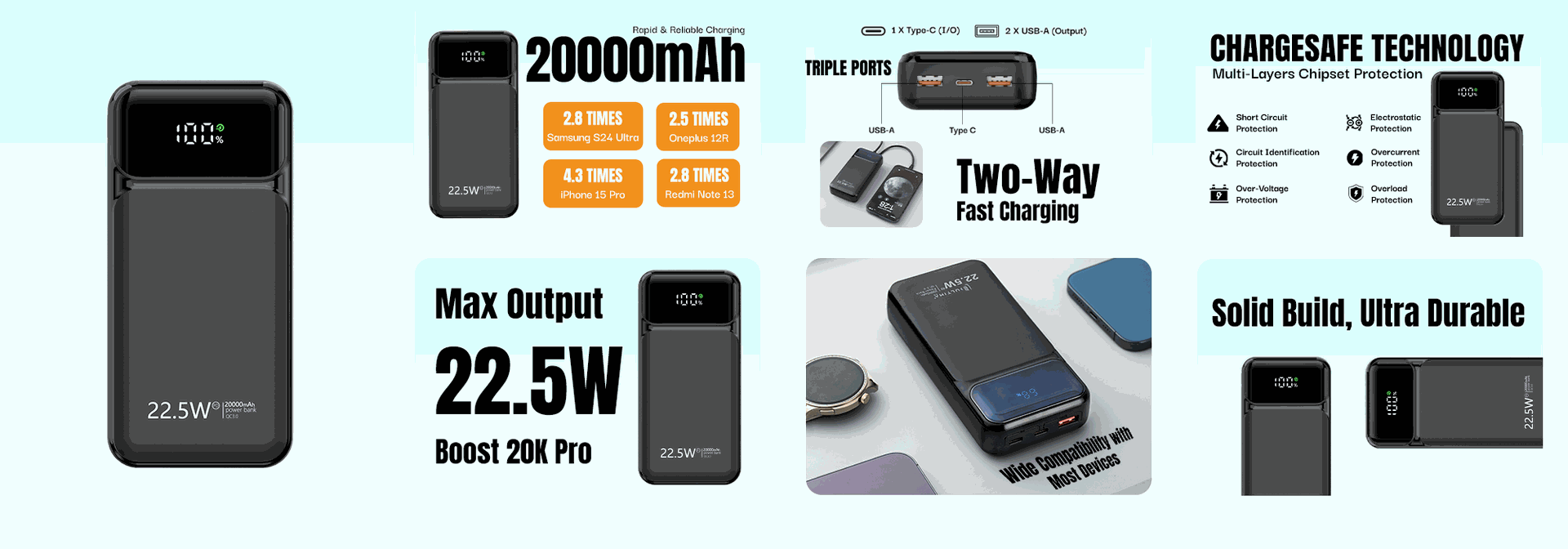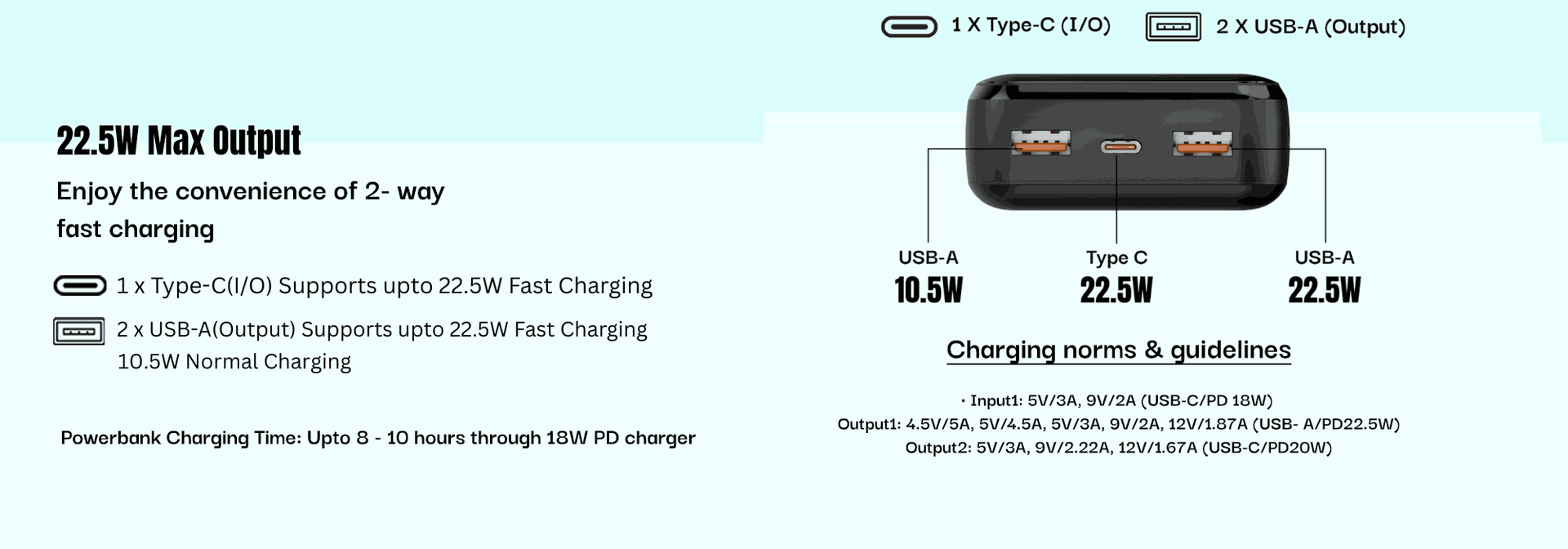 Output Port Ratings | Type-C: 5V/3A, 9V/2.22A, 12V/1.67A (USB-C/PD20W) USB-A: 4.5V/5A, 5V/4.5A, 5V/3A, 9V/2A, 12V/1.87A(USB-A/ PD22.5W) |